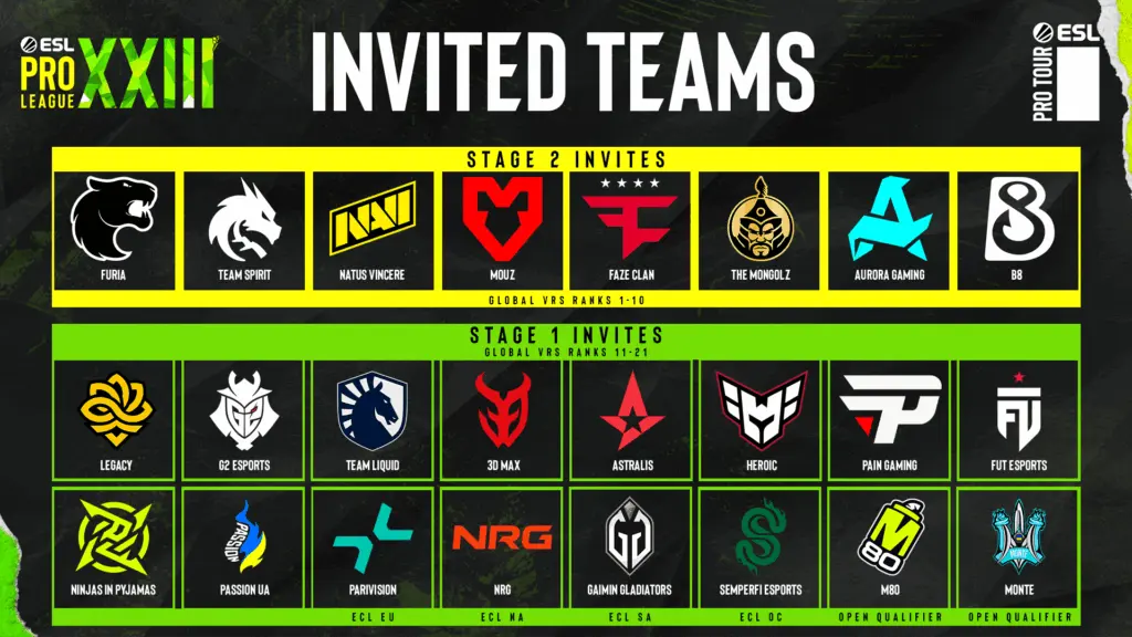 Мөн FUT баг Lynn Vision-ийг орлон уригдсан нь анхаарал татаж байна. Lynn Vision нь ESL Pro League Season 22-оос өгсөн хугацааны дараа нэрээ татсанаар нэг тэмцээн өнжих шийтгэл хүлээж байгаа юм. Харин уригдсан багуудын дунд FURIA, Spirit, MOUZ, Natus Vincere зэрэг дэлхийн топ түвшний багууд багтаж, VRS (Valve Ranking System)-ийн оноогоо ахиулах зорилготой SemperFi, Gaimin Gladiators, M80 зэрэг багууд доод шатнаас боломжоо сорихоор байна.