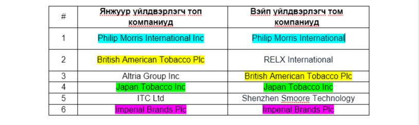 Гэвч үнэн хэрэгтээ янжуурынхан, вэйпнийхэн гэсэн ойлголт дэлхий дээр байхгүй ажээ. Тодруулбал, бүх төрлийн тамхины бизнес дэлхий даяар нэг толгойтой, хоёр гартай буюу нэг л том бүтэцтэй болсныг дараах хүснэгтээс харж болно.