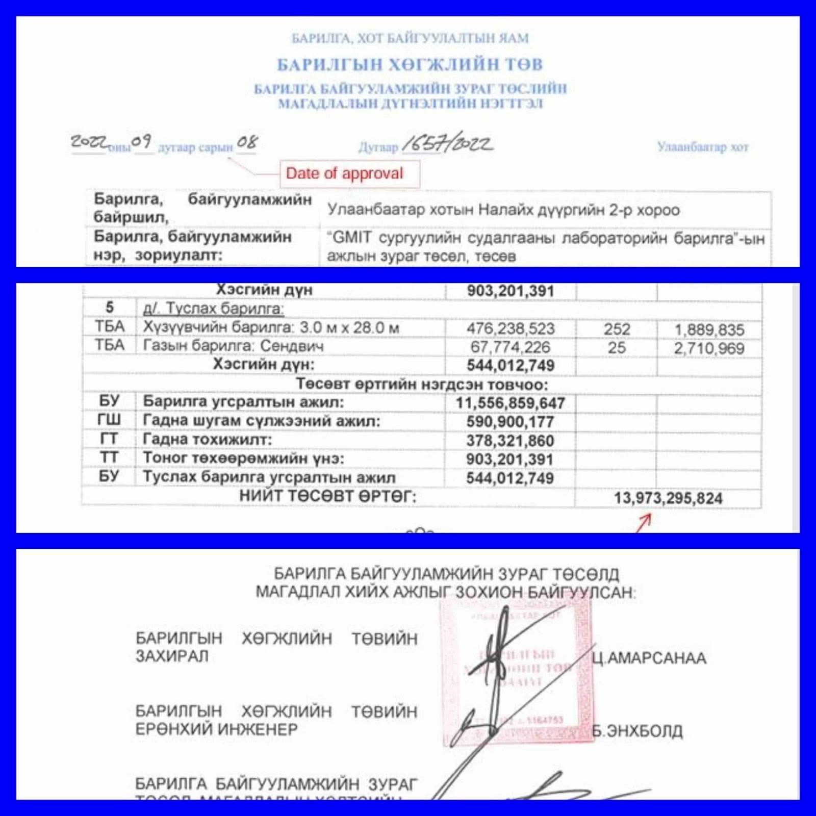 Барилгын хөгжлийн төвийн тухайн үеийн захирал Б.Амарсанаа, ерөнхий инженер Б.Энхболд, хэлтсийн дарга Э.Хангал, мэргэжилтэн Б.Тэмүүжин нарын гарын үсэг, тамгатай. Гэтэл үүнээс хоёр сар гаруйн дараа буюу мөн оны 12 дугаар сарын 26-ны өдөр Л.Энх-Амгалан тушаал гаргаж, уг төслийн төсөвт өртгийг 16 тэрбум 58 сая төгрөг болгож нэмэгдүүлсэн байгаа юм. Мэргэжлийн байгууллагын гаргасан төсвийг дураараа өөрчлөн, нэг тэрбум нэг зуун саяар нэмэгдүүлсэн нь хачирхалтай. Гэхдээ үүнд хэн ч хариуцлага хүлээгээгүй.
