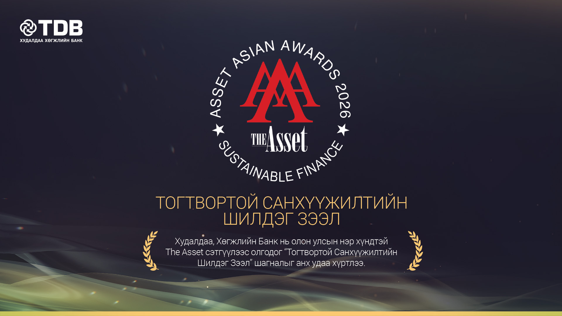 Худалдаа, хөгжлийн банк нь олон улсын санхүүгийн салбарын хамгийн нэр хүндтэй шагналуудын нэг болох “The Asset Triple A Awards”‑ийн “Тогтвортой санхүүжилтийн шилдэг зээл (Best Sustainable Loan)” төрөлд Монгол Улсаас анх удаа шалгарч, тогтвортой санхүүжилтийн чиглэл дэх манлайллаа олон улсын түвшинд дахин бататгалаа.