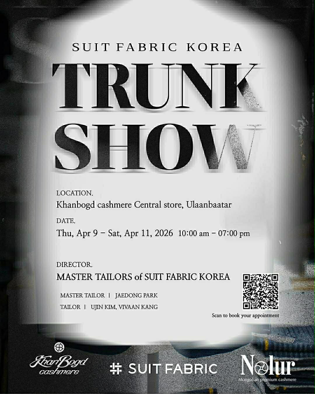 Монголын үндэсний манлай үйлдвэрлэгч “Ханбогд” кашмер ноолуурын зах зээлд чимээгүй тансаглал чиглэлээр өөрийн гэсэн өнгө төрхийг бүрдүүлээд буй “Nolur cashmere” брэндтэй хамтран Солонгосын tailor made костюмны no 1 ателье “Suitfabric”-ийн үйлчилгээг эх орондоо нэвтрүүлэхээр эхний 40 үйлчлүүлэгчээс биеийн хэмжээ авч, цор ганц хувь хүссэн хослол, хүрэм, ноолууран пальтог нь урлах транк шоу хийхээр зэхжээ.