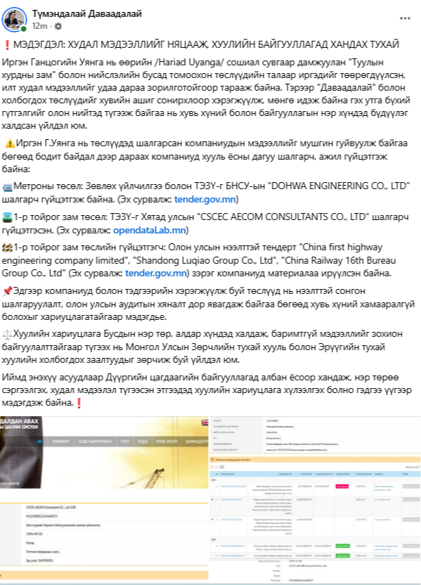 Иргэн Г.Уянга нь төслүүдэд шалгарсан компаниудын мэдээллийг мушгин гуйвуулж байгаа бөгөөд бодит байдал дээр дараах компаниуд хууль ёсны дагуу шалгарч, ажил гүйцэтгэж байна” гэлээ.