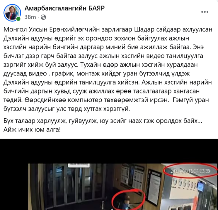Тэрбээр: "Монгол Улсын Ерөнхийлөгчийн зарлигаар Шадар сайдаар ахлуулсан Дэлхийн адууны өдрийг эх орондоо зохион байгуулах ажлын хэсгийн нарийн бичгийн даргаар миний бие ажиллаж байгаа. Энэ бичлэг дээр гарч байгаа залуус ажлын хэсгийн видео танилцуулга зэргийг хийж буй залуус. Тухайн өдөр ажлын хэсгийн хуралдаан дуусаад видео , график, монтаж хийдэг уран бүтээлчид үлдэж Дэлхийн адууны өдрийн танилцуулга хийсэн. Ажлын хэсгийн нарийн бичгийн даргын хувьд сууж ажиллах өрөө тасалгаагаар хангасан төдий. Өөрсдийнхөө компьютер төхөөрөмжтэй ирсэн. Гэмгүй уран бүтээлч залуусыг улс төрд хутгах хэрэггүй.