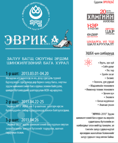 Монголын Залуучуудын Холбооноос жил бүр уламжлал болгон зохион байгуулдаг “Эврика-2013” залуу багш, оюутны эрдэм шинжилгээний бага хурал тун удахгүй 20 дах жилдээ болох гэж байна. “Шинжлэх ухаанаа аваръя, Судалж оролцоё” уриатай зохион байгуулагдаж байгаа “Эврика - 2013” ЭШБХ-ыг энэ жилээс эхлэн УИХ-ын даргын ивээл дор албан ёсоор зохион байгуулахаар болжээ.Хамгийн олон жил тасралтгүй явагдаж байгаа өргөн цар хүрээтэй, хамгийн нэр хүндтэй, хамгийн шударга ил тод шалгаруулалтаар явагддаг энэ бага хурал нь мөн хамгийн өндөр шагналтай гэнэ. Бүх их дээд сургууль, коллежийн багш, оюутнуудын хийж буй эрдэм шинжилгээ, судалгааны ажилд дэмжлэг үзүүлэх, тэдний бүтээлийг олон нийтэд сурталчилан таниулах, бодит биеллээ олоход нь туслахад зорилготой энэхүү хурлыг жил бүр оюутан залуучууд хүсэн хүлээдэг. Эрдэм шинжилгээний хуралд оролцох залуу багш, оюутны материаллыг 04-р сарын 20-ыг хүртэл МЗХ-ны төв байранд хүлээн авч байгаа юм байна.