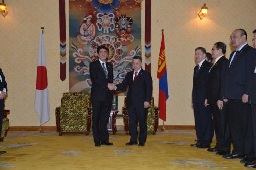УИХ-ын дарга З.Энхболд манай улсад албаны ёсны айлчлал хийж буй Японы Ерөнхий сайд Шинзо Абэг өнөөдөр өглөө /2013.03.31/ хүлээн авч уулзлаа.Уулзалтын эхэнд УИХ-ын дарга хоёр улсын харилцан ойлголцол, итгэлцэл улам гүнзгийрч, харилцаа, хамтын ажиллагаа Стратегийн түншлэлийн зарчмаар идэвхитэй хөгжиж байгаад сэтгэл хангалуун байгаагаа илэрхийллээ. Түүнчлэн Японы Ерөнхий сайд энэхүү айлчлалынхаа үеэр Стратегийн түншлэлийг эрх чөлөө, ардчилал, энх тайван, бие биедээ харилцан туслах гэсэн үзэл санаагаар эрчимжүүлэн хөгжүүлэх санаачилга дэвшүүлж байгаад нь талархаж байна гэдгээ хэлэв.