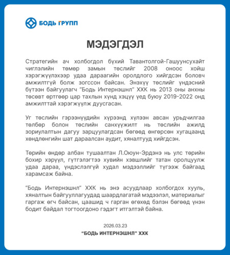 Бодь Интернэшнл ХХК мэдэгдэл гаргажээ