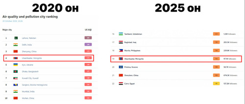 Дэлхийн хотуудын агаарын чанарыг хэмждэг Швейцарын “IQAir” сайтын мэдээлснээр Улаанбаатар хот агаарын бохирдол ихтэй хотуудын жагсаалтын эхний 5-т багтдаг байсан цаг саяхан.